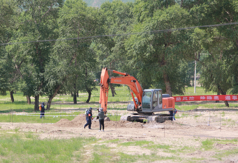 演練場景是這樣的:巡線人員在日常巡檢過程中,發(fā)現(xiàn)某施工隊利用機械在承德人和礦業(yè)有限責任公司“伊石特”、“朗利特”環(huán)保型伊利石功能材料科技產(chǎn)業(yè)園區(qū)前,管道上方進行道路改造開挖作業(yè)。線路巡檢人員發(fā)現(xiàn)此情況后,進行現(xiàn)場阻止,但施工人員不聽勸阻,繼續(xù)挖掘作業(yè),導(dǎo)致長輸管道天然氣泄漏,施工人員在撤離事故現(xiàn)場時受傷。管線存在泄漏擴大導(dǎo)致人員窒息及燃爆的危險,對周邊群眾、村莊和公路造成了嚴重威脅。線路巡線人員立即把基本情況報告給維護項目部和管輸中心應(yīng)急辦公室;管輸中心接到報警后立即將此情況匯報至圍場縣應(yīng)急局;并通知各應(yīng)急專業(yè)處置人員到達現(xiàn)場進行人員救護、隔離等應(yīng)急處置工作;圍場縣應(yīng)急局接到電話后立即啟動《突發(fā)事故應(yīng)急救援預(yù)案》,相關(guān)單位迅速反應(yīng),到達事故現(xiàn)場,根據(jù)各小組職責開展相應(yīng)工作;最后在各應(yīng)急處置小組的積極配合下成功地控制了事態(tài),消除了影響,恢復(fù)了正常生產(chǎn)。